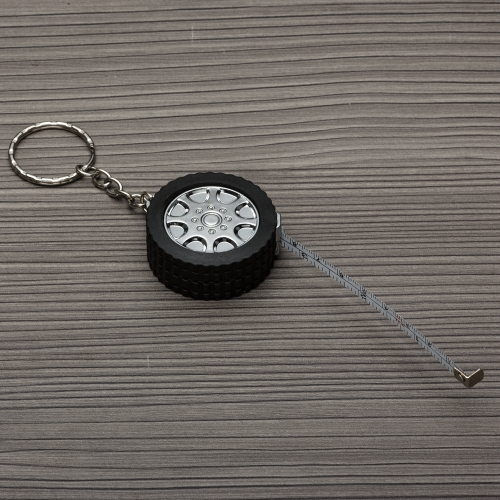Descrição: Chaveiro plástico em formato de pneu de carro e argola metálica. Possui uma trena com fita de alcance máximo de 1 metro, além de exibir suas medidas em pés e polegadas.
