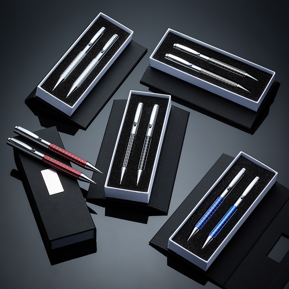 Descrição: Kit caneta e lapiseira de metal em estojo papelão com placa de metal(parte interna do estojo revestida com espuma). Caneta e lapiseira prata com detalhes coloridos e quadriculados, clip metal com anel superior na ponta e dois anéis centrais e acionam por giro.
