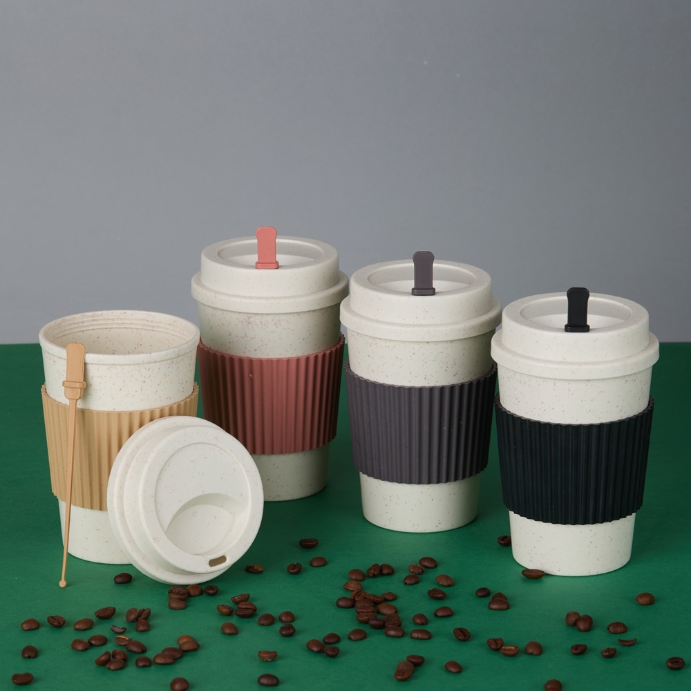 Descrição: Copo em fibra de trigo livre de BPA, capacidade para até 450ml e tampa rosqueável com bocal. Acompanha mexedor e manga antiderrapante. PEDIDO MÍNIMO: 100 UNIDADES