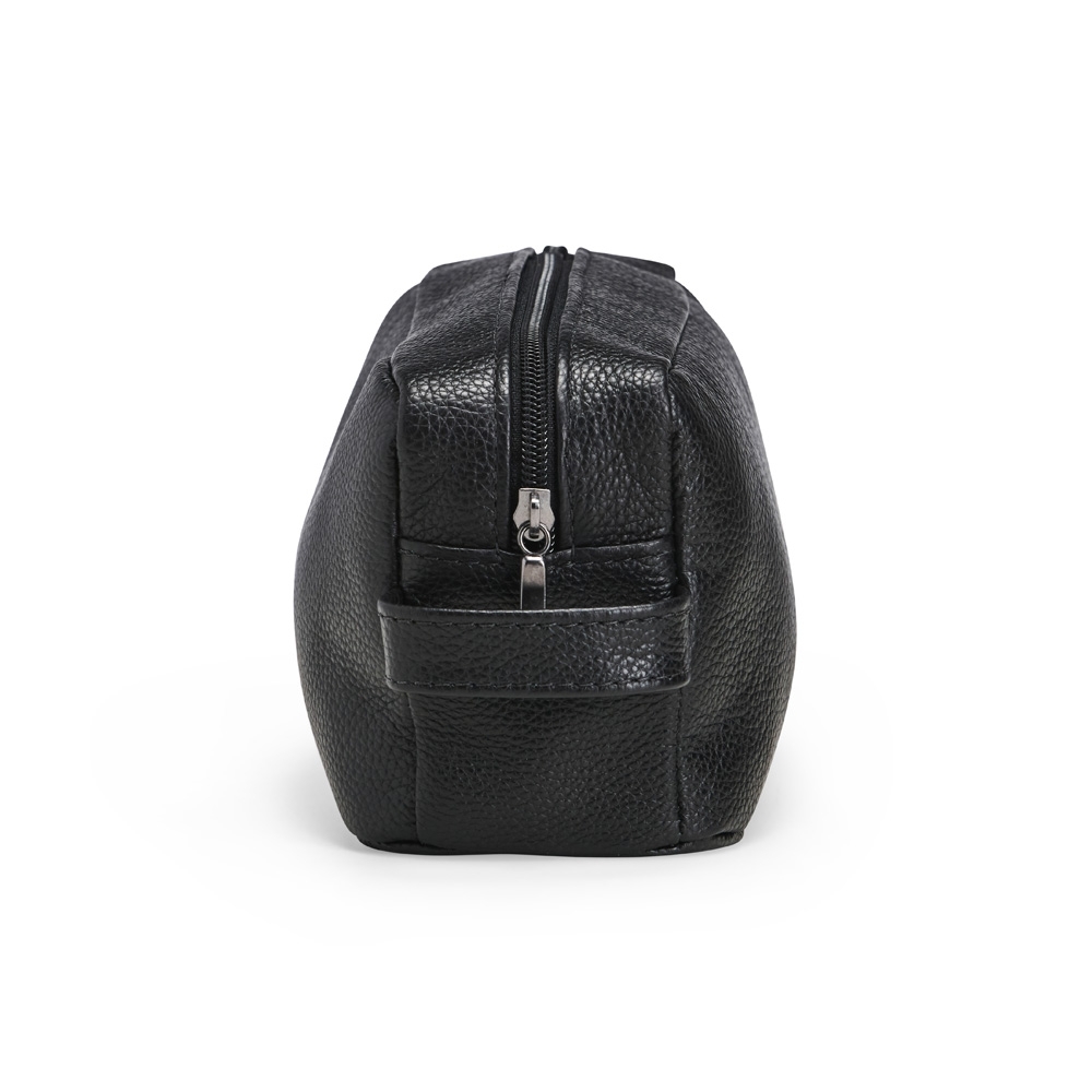 Descrição: Nécessaire em couro, com fechamento em zíper, alça lateral de mão e plaquinha presa a cordão de nylon. Altura : 10,5 cm / Largura : 22 cm / Profundidade : 9,5 cm PEDIDO MÍNIMO: 100 UNIDADES